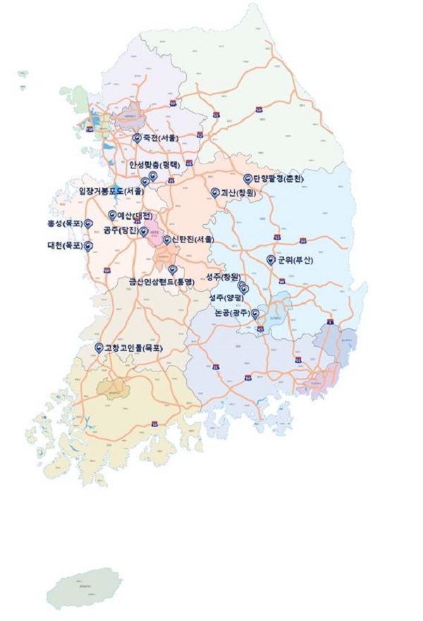 ▲ 초급속충전소 위치도환경부는 주요 고속도로에 대한 현장조사를 거쳐 경부고속도로 등 8개 고속도로의 휴게소 16곳에 초급속 충전기 32기를 구축하는 배치 계획을 확정했다.