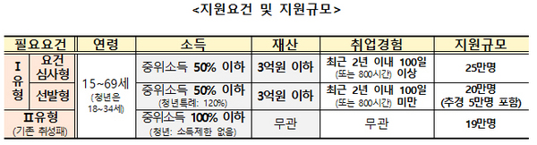 국민취업지원제도는 취업 지원 서비스와 구직촉진수당(월 50만원×6개월, 최대 300만원)을 제공하는 Ⅰ유형과 취업 지원 서비스와 취업활동비용(최대195.4만원)을 제공하는 Ⅱ유형 등으로 나뉜다.