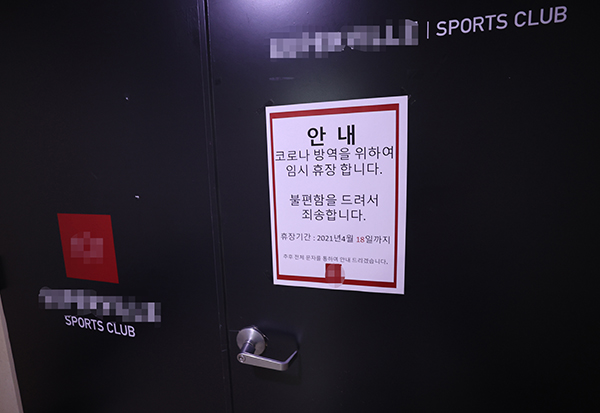 ▲ 확진자가 발생한 스포츠클럽에 붙은 휴장 안내문. (사진=(c) 연합뉴스)중앙방역대책본부는 실내체육시설에서 발생한 1개 사례에 대해 세종대학교와 협동해 실내 환경과 바이러스 확산에 대한 컴퓨터 시뮬레이션을 분석했다.