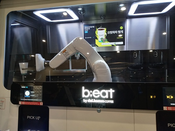 ▲ 로봇 카페에서 로봇이 커피를 서빙하고 있는 모습. (사진=대한민국 정책기자단)극지환경 로봇, 지능형 농작업 로봇 등 틈새시장형 10대 분야 9개 기술개발 과제에는 145억원을 신규 투자한다.