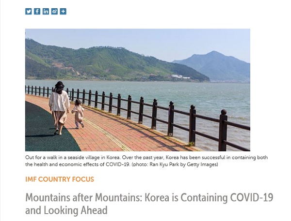 IMF는 이날 홈페이지를 통해 공개한 보고서 ‘산 넘어 산: 한국의 성공적 코로나19 영향 감축 및 진전(Mountains after Mountains: Korea is Containing COVID-19 and Looking Ahead)’에서 이같이 밝혔다.