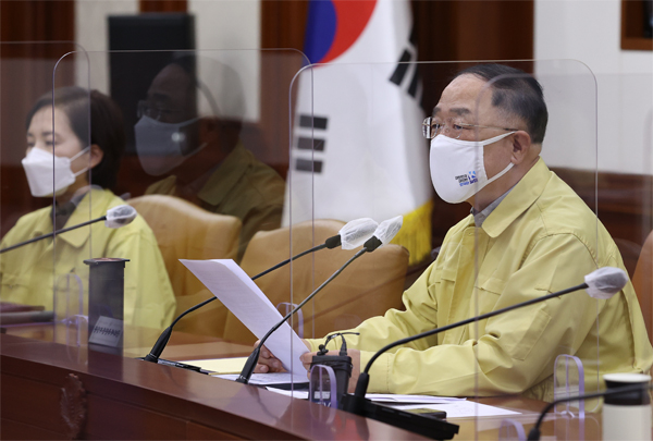 ▲ 홍남기 국무총리 직무대행이 2일 정부서울청사에서 열린 코로나19 대응 중앙재난안전대책본부 회의에서 발언하고 있다.홍 총리대행은 “방역당국은 ‘백신 접종효과 최대화를 위해 도입된 백신을 가장 효율적으로 배분하고 접종해야한다’는 대원칙하에 전문가들과 치밀하게 협의해 1차 접종자와 2차 접종자에 대한 배분, 1차 접종시기와 2차 접종시기를 결정하고 접종 상황에 따라 필요시 기민하게 일정조정 등을 해오고 있다”고 설명했다.