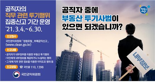 [일간환경연합 장민주 기자]국민권익위원회(위원장 전현희, 이하 국민권익위)가 지난 3월 4일부터 「공직자 직무 관련 투기행위 집중신고 기간」을 운영한 결과, 내부정보를 이용한 투기행위 신고가 가장 많이 접수된 것으로 나타났다.