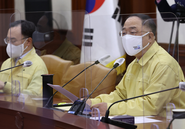 ▲ 홍남기 국무총리 직무대행(경제부총리 겸 기획재정부 장관)이 9일 정부서울청사에서 열린 코로나19 중대본 회의에서 발언하고 있다.정부는 지난달 26일부터 이날까지 2주간을 특별 방역점검주간으로 설정해 방역을 강화해 왔다.