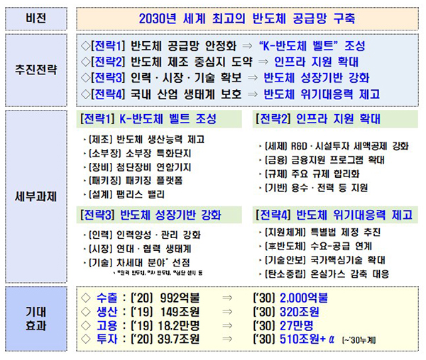 또한 세계 최고의 반도체 공급망을 구축하기 위해 ▲반도체 공급망 안정화를 위한 K-반도체 벨트 조성 ▲반도체 제조 중심지 도약을 위한 인프라 지원 확대 ▲인력·시장·기술 확보로 반도체 성장기반 강화 ▲국내 산업 생태계 보호로 반도체 위기대응력을 높여나간다.