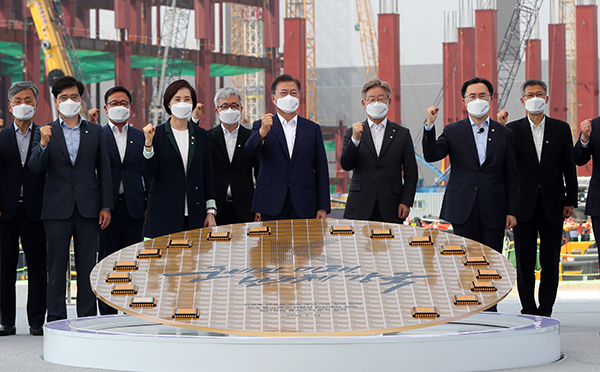 ▲ 문재인 대통령이 13일 오후 경기 평택시 삼성전자 평택단지 3라인 건설현장에 마련된 야외무대에서 열린 ‘K-반도체 전략 보고’에서 ‘반도체 생태계 강화 연대 협력 협약식’을 마친 후 참석자들과 기념촬영을 하고 있다. (사진=(c) 연합뉴스)이번 추진전략에서는 먼저 판교와 기흥~화성~평택~온양의 서쪽, 이천~청주의 동쪽을 용인에서 연결해 K-반도체 벨트를 완성, 세계 최대의 반도체 국가로 도약할 계획이다.