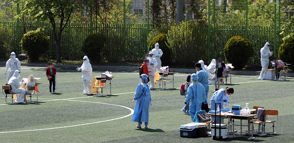 ▲ 지난 19일 광주의 한 초등학교 운동장에 신종 코로나바이러스 감염증(코로나19) 임시 선별진료소가 마련돼 재학생이 전수 검사에 참여하고 있는 모습. (사진=(c) 연합뉴스)그 기간 교육부는 서울특별시·울산광역시교육청의 이동형 유전자증폭 검체팀을 감염병에 대한 신속한 선제적 검사를 위해 시범 운영하고, 학원의 선제적 유전자증폭 검사와 서울대학교의 신속분자진단 등을 실시했다.