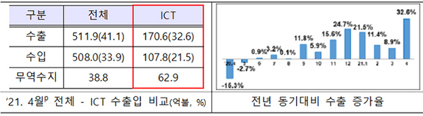 과학기술정보통신부는 4월 정보통신기술(ICT) 수출은 170억 6000만 달러, 수입은 107억 8000만 달러, 무역수지는 62억 9000만 달러 흑자로 잠정 집계됐다고 17일 밝혔다.