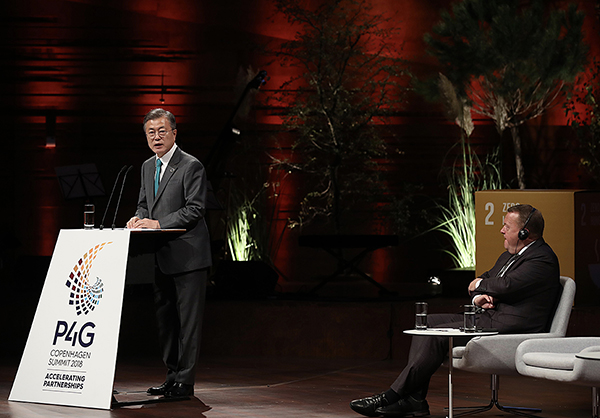 ▲ 문재인 대통령이 지난 2018년 10월 20일 오전(현지시간) 덴마크 코펜하겐 시내 대니쉬 라디오 콘서트홀에서 열린 제1차 P4G(녹색성장 및 2030 글로벌 목표를 위한 연대) 정상회의에서 기조연설을 하고 있다. (사진=청와대)문 대통령은 30일 P4G 정상회의 공식 개회를 선포하고, 이튿날 정상 토론세션의 의장으로 녹색회복·탄소중립·민관협력과 관련된 회의를 주재한다. 이어 폐회식과 함께 서울 선언문을 채택할 예정이다.