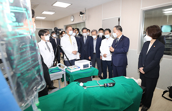 ▲ 홍남기 부총리 겸 기획재정부 장관이 26일 서울대병원 의학연구혁신센터에서 열린 혁신성장 BIG3 추진회의에 앞서 업체에서 의뢰한 의료기기사용 적합성 실험에 관해 설명을 듣고 있다. (사진=(c) 연합뉴스)정부는 먼저 국산 의료기기 사용경험을 축적할 수 있도록 지원하고 기술 가치에 대한 보상체계 마련을 통해 국산 의료기기 구매로 연계하기로 했다.