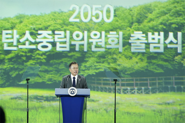 ▲ 문재인 대통령이 29일 오후 서울 동대문디자인플라자에서 열린 ‘2050 탄소중립위원회 출범식’에서 격려사를 하고 있다. (사진=청와대)2050 탄소중립위원회는 김부겸 국무총리와 민간전문가인 윤순진 서울대 환경대학원 교수가 공동위원장을 맡은 대통령 직속기구로, 모든 영역의 탄소중립 정책을 마련하고 이행을 주도하는 컨트롤타워 역할을 하게 된다.