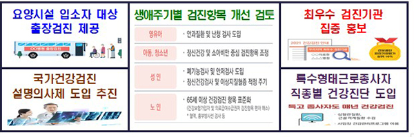 이에 따라 부담 없고 편리한 건강검진을 위해 수요자의 편의성과 안전을 최우선으로 국가건강검진 인프라를 개선하고, 특히 생애주기별 건강영향 요인과 특성을 고려해 건강검진을 개선한다.