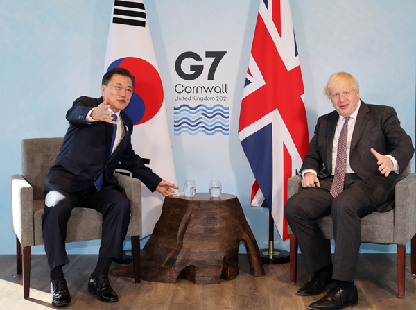 ▲ G7 정상회의 참석차 영국을 방문 중인 문재인 대통령이 13일(현지시간) 영국 콘월 카비스베이에서 열린 보리스 존슨 영국 총리와 양자회담에서 대화하고 있다. (사진=(c) 연합뉴스)문 대통령은 “영국은 한국의 혈맹으로, 한국전쟁 당시 8만 명이 넘는 영국인들이 참전했던 그 소중한 우정을 한국인들이 기억하고 있다”고 하자, 존슨 총리는 “영국은 한국과의 파트너십을 중요하게 생각하고 있으며, 한국과의 안보 협력 강화를 기대한다”고 화답했다.