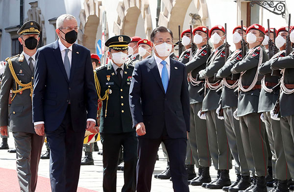 ▲ 오스트리아를 국빈 방문중인 문재인 대통령이 14일(현지시간) 비엔나 호프부르크궁 발하우스 광장에서 열린 공식환영식에서 알렉산더 판 데어 벨렌 대통령과 의장대를 사열하고 있다. (사진=(c) 연합뉴스)[일간환경연합 김경훈 기자]오스트리아를 국빈 방문 중인 문재인 대통령은 14일(현지시간) 수도 비엔나의 호프부르크 궁에서 열린 공식 환영식에 이어 판 데어 벨렌 대통령과 정상회담을 갖고 ▲양국 관계 ▲기후·환경 등 글로벌 현안 ▲한반도 및 국제 정세 등에 대해 폭넓게 논의했다.