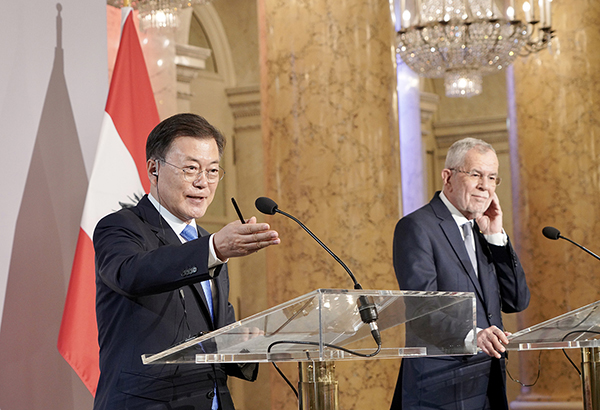 [일간환경연합 장영기 기자]오스트리아를 국빈 방문 중인 문재인 대통령은 14일 “북한이 동의한다면 북한에 백신 공급을 협력하는 것을 적극적으로 추진하겠다”고 밝혔다.