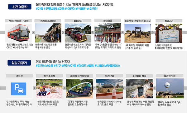 ▲ 경기도 수원시 지능형(스마트)관광도시 방문객 시나리오.‘지능형(스마트)관광도시 조성 사업’은 첨단정보통신기술을 관광 분야에 접목해 경쟁력 있고 편리한 관광서비스를 제공할 수 있는 기반을 마련하고 여행객들의 만족도를 높이기 위한 지역관광 첨단화 기반 사업이다.