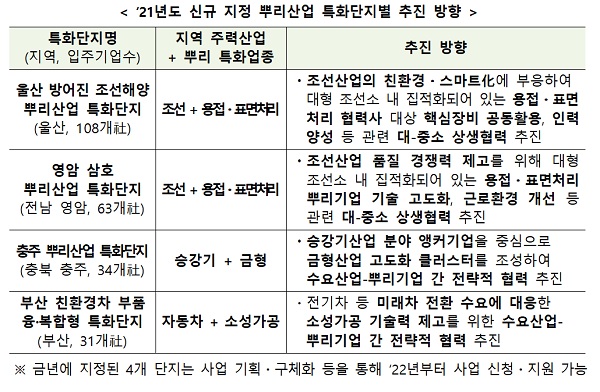 신규 지정되는 4개 단지는 대-중소 상생, 수요산업-뿌리기업 간 협력을 바탕으로 지역 주력산업과 연계한 고도화 전략을 추진할 계획이다.