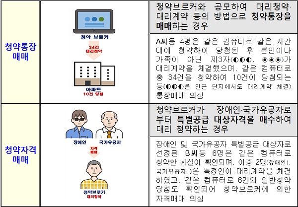 ▲ 부정청약 및 불법공급 유형별 사례주택 공급질서 교란행위로 적발된 유형을 보면 먼저, 청약브로커가 당첨 가능성이 높은 청약자의 금융인증서 등을 넘겨받아 대리청약하거나, 당첨 후 대리계약을 체결하는 등 청약통장 또는 청약자격을 매매하는 방식의 통장매매 부정청약이 185건이었다.