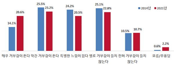 반면 ‘치매’라는 용어를 변경하는 것에 대해서는 ‘그대로 유지하든지 바꾸든지 무방하다’는 응답이 45%로 가장 많았고, ‘유지해야 한다’ 27.7%, ‘변경해야 한다’ 21.5% 순으로 나타났다.