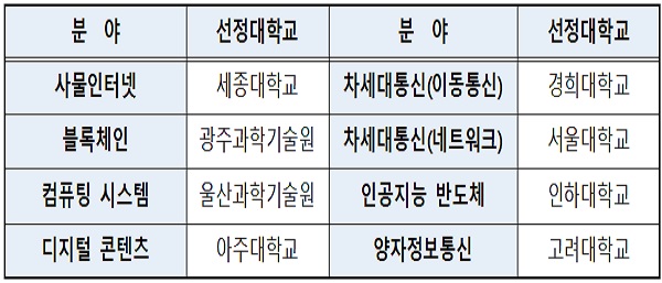 8개 과제는 사물인터넷(세종대학교), 블록체인(광주과학기술원), 컴퓨팅시스템(울산과학기술원), 디지털콘텐츠(아주대학교), 차세대통신/이동통신(경희대학교), 차세대통신/네트워크(서울대학교), 인공지능반도체(인하대학교), 양자정보통신(고려대학교)이다.