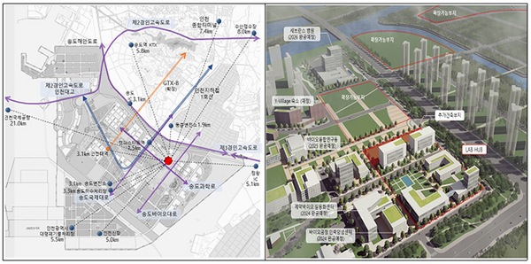 ▲ 인천 송도 ‘K-바이오 랩허브’ 후보지 위치 및 예상 조감도.후보지로 선정된 인천 송도 지역은 삼성바이오로직스, 셀트리온 등 국내 대표적인 바이오 앵커기업과 함께 송도 세브란스 병원 등 병원, 연구소 등이 집약돼 있어 산·학·연·병 협력 네트워크가 중요한 ‘K-바이오 랩허브’에 적합하다는 평가를 받았다. 부지 무상제공, 높은 재정 지원계획 등 사업계획도 높은 점수를 얻었다.