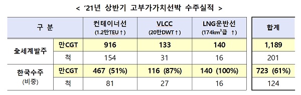 이번 성과는 우리나라 조선업계가 선도하고 있는 고부가가치선박 수주실적이 큰 기여를 했다. 고부가가치선박 전세계 발주량 1189만CGT 중 723만CGT(61%)를 국내 조선업계가 수주(국내 전체수주량 대비 66%)했다.