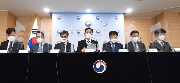 ▲ 한훈 기획재정부 차관보(사진 가운데)가 13일 오후 서울 광화문 정부서울청사에서 열린 ‘한국판 뉴딜 2.0’ 관련 관계부처 합동브리핑에서 발표문을 낭독하고 있다. (사진=기획재정부)한국판 뉴딜 2.0은 지난해 7월 발표한 1.0의 업그레이드 버전으로, 코로나 사태 이후 양극화를 해소하고 전 세계적인 디지털화, 탄소중립 등 과제를 보강했다.