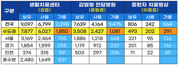 이와 관련해 14일 0시 기준으로 중환자 전담치료병상은 564병상(70.0%), 감염병 전담병원 병상은 3475병상(45.5%)이 사용 가능하며 생활치료센터는 2298병상(25.3%)을 가용할 수 있다.