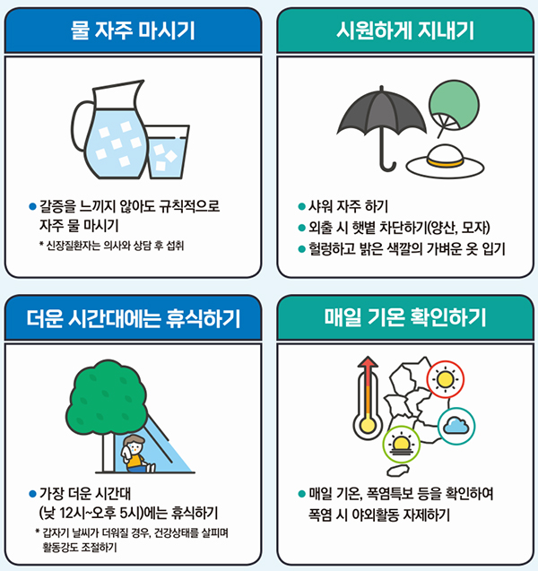 먼저 기온이 높은 낮 시간대 작업을 줄이고 외출을 자제하며, 갈증이 나지 않더라도 규칙적으로 수분을 섭취하고 어지러움, 두통, 메스꺼움 등의 증상이 나타나면 즉시 활동을 멈추고 시원한 곳으로 이동해 휴식을 취한다.