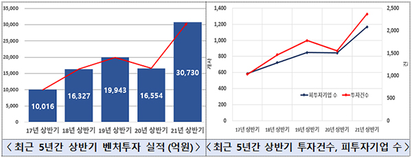올해 상반기 투자 건수와 피투자기업 수 역시 각각 2367건, 1166개사로 상반기 기준 역대 최다 실적을 기록했으며 건당 투자금액은 평균 13.0억원, 기업당 투자금액은 평균 26.4억원으로 나타났다.