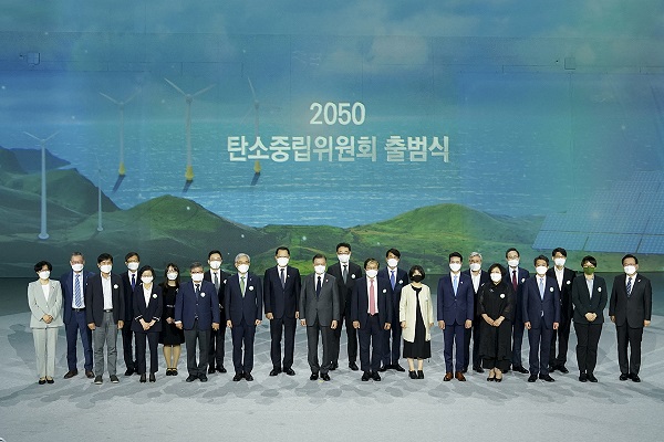 ▲ 문재인 대통령이 5월 29일 오후 서울 동대문디자인플라자에서 열린 ‘2050 탄소중립위원회 출범식’에서 참석자들과 기념촬영을 하고 있다. (사진=청와대)위원회는 이날 공개한 세 가지 시나리오 초안에 대해 9월까지 폭넓은 의견수렴을 진행할 계획이다.