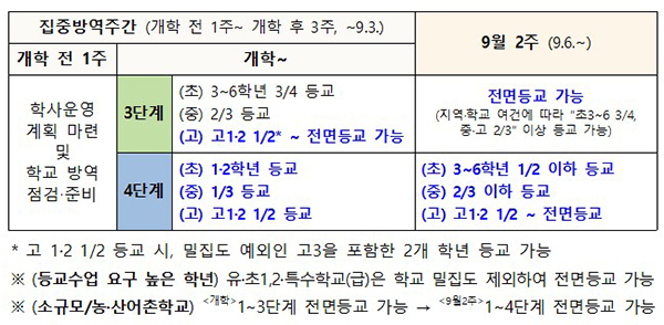 특히 개학 이후 3주간의 집중방역주간을 거쳐 9월 6일부터는 거리두기 3단계에서는 전면등교가 가능해지며, 4단계에서도 등교 수업에 대한 요구가 높은 학생을 포함해 등교확대가 이뤄진다.