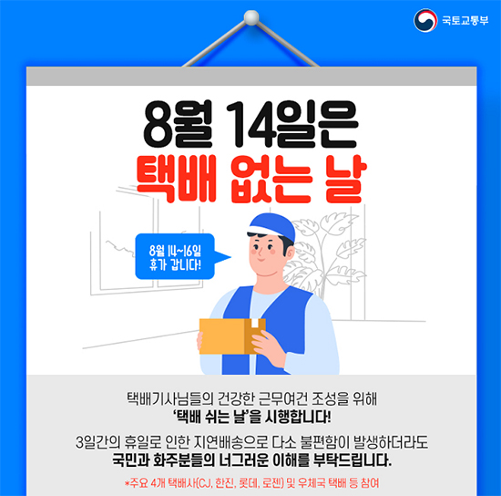 [일간환경연합 장민주 기자]올해 8월 14일에도 ‘택배 쉬는 날’이 시행된다.