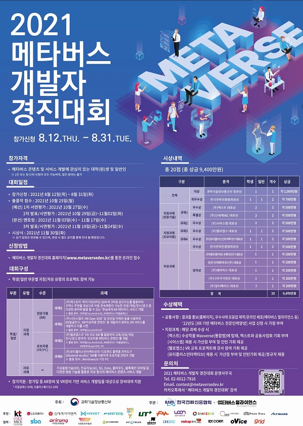 한편, 대회 세부내용은 과기정통부 사업공고와 한국전파진흥협회 사업공고를 통해 확인할 수 있으며, 참가 신청은 메타버스 개발자 경진대회 누리집(www.metaversedev.kr)에서 온라인으로 하면 된다.