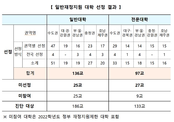 선정 규모는 2019~2021년 일반재정지원 수준과 코로나19 위기 극복을 위한 대학 현장의 재정지원 확대 요청, 학령인구 감소에 대응한 과감한 자율혁신 및 체질개선 촉진 필요성 등을 고려해 결정했다.