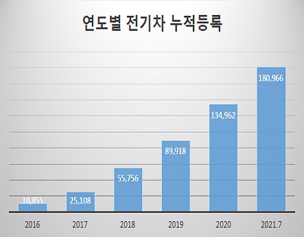 전기차는 정부의 친환경차 보급 확대 노력과 국민들의 높은 관심 속에서 2019년 말 9만대에서 1년 반 만에 누적대수 18만 1000대로 2배가 증가한 것으로 나타났다.