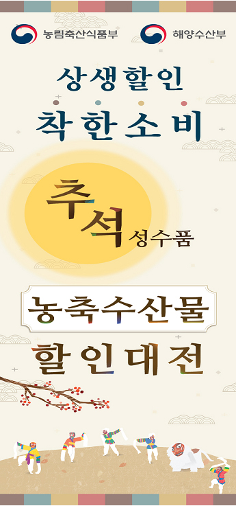 정부 관계자는 “이번 추석 성수품 농축수산물 할인대전을 통해 코로나19 장기화로 어려움을 겪고 있는 농축수산물 판로확대를 지원하고 소비자들의 장바구니 부담을 덜어줄 수 있는 기회가 되길 기대한다”고 밝혔다.