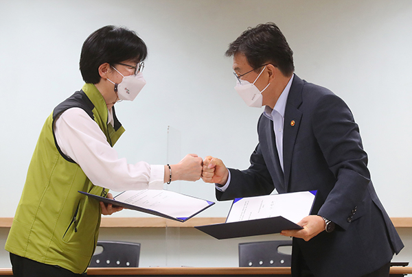 ▲ 나순자 보건의료노조 위원장(왼쪽)과 권덕철 보건복지부 장관이 2일 새벽 서울 영등포구 의료기관평가인증원에서 13차 노정실무교섭이 타결된 뒤 합의문 서명에 앞서 주먹을 부딪치며 인사하고 있다. (사진=보건복지부)합의문에서 양측은 공공의료를 강화하고 감염병 대응체계를 구축하기 위해 2024년까지 권역 감염병전문병원 4곳을 설립·운영하고 3곳을 추가 확대하기로 했다.