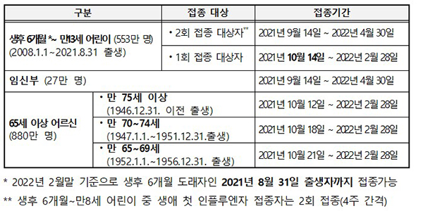 2021~2022절기 인플루엔자 국가예방접종 대상자별 접종기간.