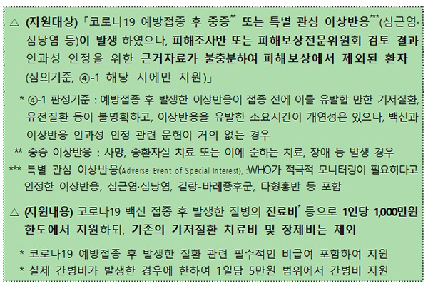 그동안 정부는 인과성 근거 불충분한 중증 환자 의료비 지원은 코로나19 예방접종 후 ‘중환자실 입원치료 또는 이에 준하는 질병이 발생한 경우’ 등 중증 환자에 한정해 지원했다.
