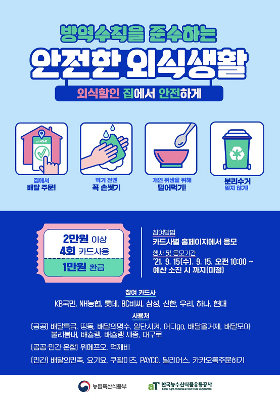 정현출 농식품부 식품산업정책관은 “엄중한 코로나19 상황을 고려해 국민의 자발적인 거리두기 실천을 지원하는 차원에서 비대면 외식 할인 지원 사업을 재개하게 됐다”며 “코로나19 방역 여건이 개선되면 방역 당국과 협의해 방문 등 대면 외식에 대한 할인 지원 사업도 신속히 개시할 수 있도록 철저히 준비하겠다”고 밝혔다.