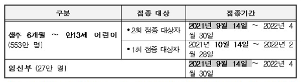 14일부터는 2회 접종이 필요한 어린이와 임신부를 대상으로 시작되고, 1회접종 대상 어린이는 오는 10월 14일부터 시작한다.