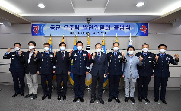 ▲ 박인호 공군참모총장이 지난 23일 충남 계룡대 공군본부에서 열린 ‘공군우주력발전위원회 출범식’에 참석해 이상률 한국항공우주연구원장 및 참석자들과 기념촬영을 하고 있다(사진=공군)기존의 항공우주전투발전단 소속 우주처에서 공군참모총장 직속 부서로 예속 변경된 ‘공군본부 우주센터’는 국방부·합동참모본부 등 상급부대 및 항공우주연구원·천문연구원 등 대외기관과 우주역량 발전을 위한 효과적인 협업과 상호교류, 적시적인 우주정책 수립·시행을 위해 신설됐다.