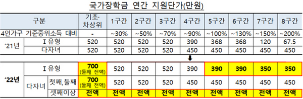구체적으로 서민·중산층까지 등록금 절반을 지원받을 수 있도록 5~8구간의 국가장학금 지원한도를 대폭 인상한다. 5~8구간 국가장학금 지원단가를 반값 등록금 수준으로 인상해 개인수준에서도 실질적인 ‘반값 등록금’을 달성하겠다는 것이다.
