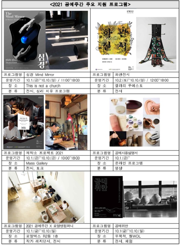 ‘2021 공예주간’ 행사는 코로나19 장기화로 지친 국민이 주변의 가까운 곳에서 공예를 경험하고 일상을 치유해 생기 넘치는 가을날을 보내길 바라는 의미를 담아 주제를 정했다.