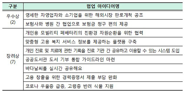지난 2017년부터 공모를 진행한 협업 아이디어 제안은 일반 국민들이 직접 생활 속 불편 사항들을 발굴해 문제 해결을 위한 기관 간 협업을 도모하기 위해 마련됐다.