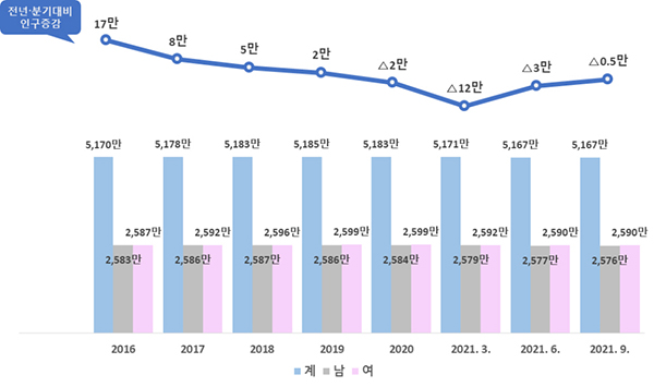 2016년~2021년 9월 인구수 및 전년·분기 대비 인구증감
