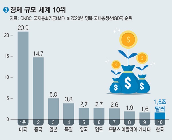 코로나19 위기속에서도 지난해 한국의 1인당 국내총생산(GDP)은 3만1497달러로 처음으로 G7 국가인 이탈리아(3만1288달러)를 추월했다. 경제순위도 지난 2019년 12위로 하락한 지 1년 만에 러시아와 브라질을 제치고 전세계 톱10에 진입했다.