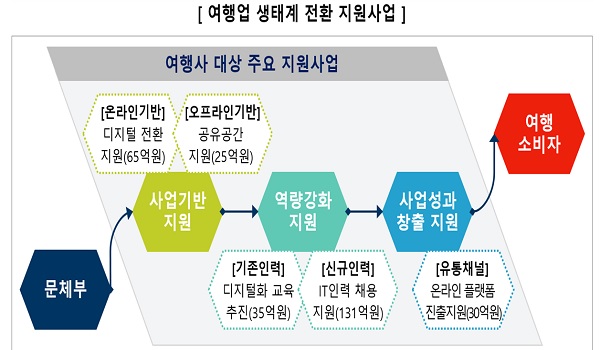 문체부는 지난 추경을 통해 확보한 예산으로 중소여행사 온라인 유통플랫폼 사업화와 관광업계 정보통신기술(ICT) 인력 신규 채용, 지역여행사 사무 공유공간 등을 적극 지원한다.