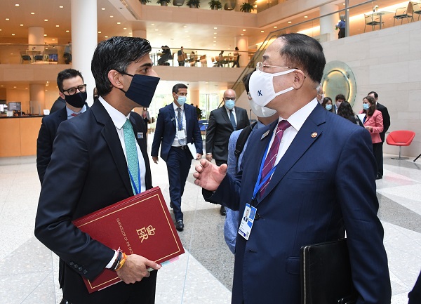 홍 부총리는 리시 서낙 영국 재무장관과 만난 자리에서 그린본드의 런던 증권거래소(LSE) 상장과 COP26을 계기로 양국 간의 금융/그린 협력을 강화할 것을 제안했다.